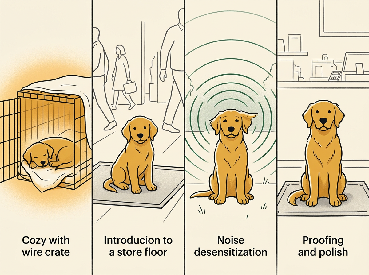 Controlled exposure to foot traffic is where it starts getting real. Keep your pup leashed, on a mat behind the counter. Not free-roaming. Reward calm behavior when customers enter. If your pup gets overstimulated, remove them. Start with 15 minutes on the floor, then back to the crate. Build duration gradually.